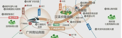 交通枢纽:项目位于广州市番禺区汉溪大道中,靠近广州南站,周边多条地铁线交汇(7号线、2号线、佛山2号线及22号线),形成便捷的交通网络。