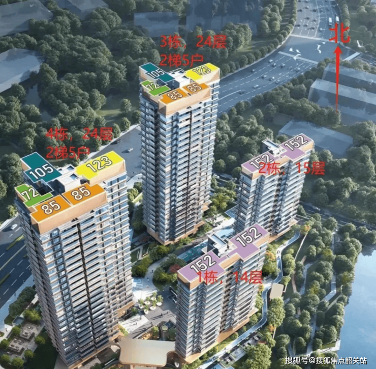 珠实天河都荟首推的是北地块,该地块由4栋住宅组成,建面72-123平分布在3、4栋,其中85平货量最多,有四条梯腿,72、105、123平各占2条梯腿。