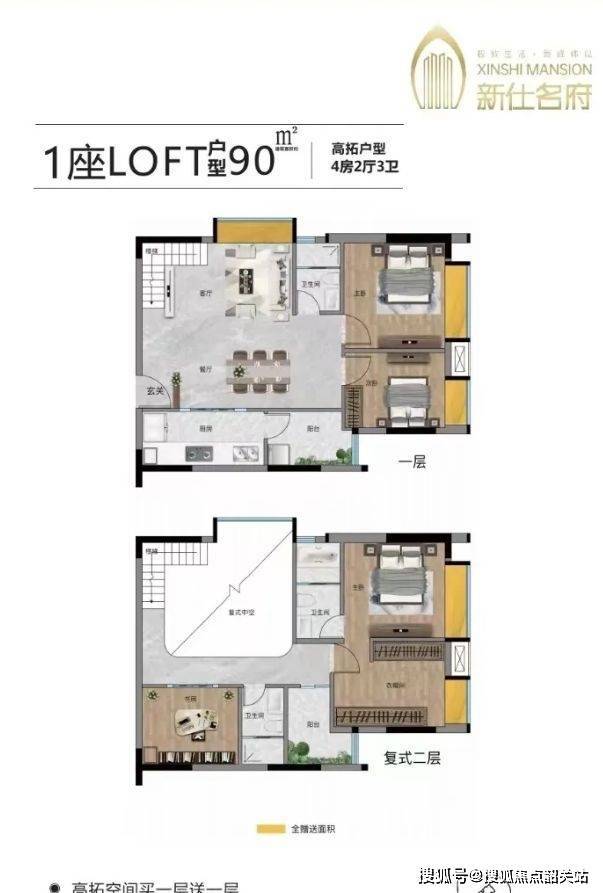 71 - 95㎡四房:5.5 米层高,买一层送一层,空间利用率高,实现四房设计,满足多人口家庭居住需求。可明火且民用水电计价,生活成本较低。独特的复式设计,动静分区明显,楼下活动区,楼上休息区,为居民提供舒适、私密的居住空间。