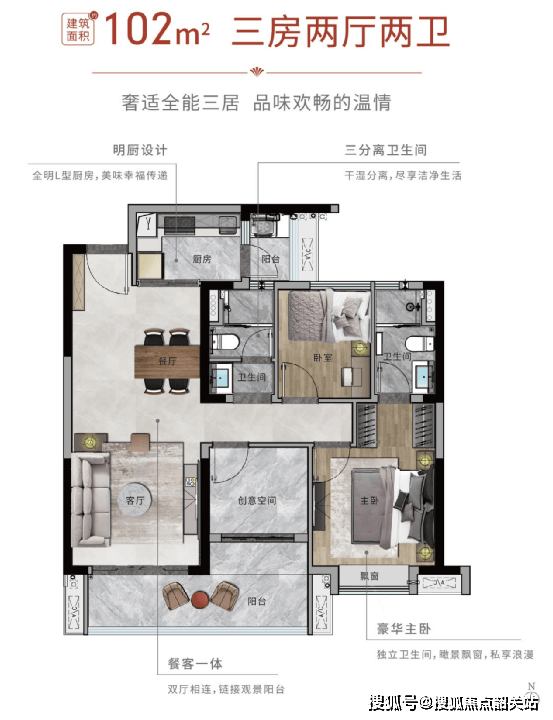 南北通透:客厅、主卧、次卧三开间朝南,采光面超12米;