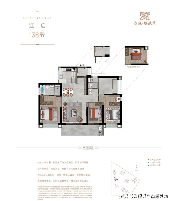 138㎡4房2厅2卫:四开间朝南,采光、通风好。拥有独立入户花园和约6.8米的江景阳台,进一步拉升改善住户的居住体验。