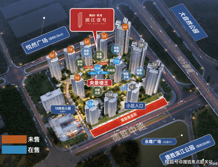 美的・世茂滨江壹号占据顺德新中芯,左享超 2000 亿科技城爆发红利,右揽德胜新城 20 年发展成熟配套。不仅临一线德胜河,3 大公园环簇、4 大商圈咫尺尽享,而且约 500 米处便是地铁 11 号线 & 26 号线德胜西路站(规建中),教育、医疗等配套也近在咫尺。此次加推的 10 座央景楼王位于小区中心位置,既避开主干道噪音,又临近大泳池,拥有最佳景观视野,前揽德胜河一线江景,后拥顺峰山山景,推窗即享四季园林盛景。建面约 98 - 142㎡的三至四房户型方正,空间实用,是当之无愧的 “六边形战士”。
