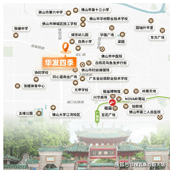 华发四季虽处老城,但内部园林由知名景观团队操刀,打造“三重归家礼序”:入口水景迎宾、中央草坪休憩、宅间林荫步道,绿化率超35%。社区配备恒温泳池、儿童乐园、健身跑道、多功能会所等设施,满足全龄段活动需求。更难得的是,项目东侧紧邻中山公园(步行8分钟),这座百年公园湖光潋滟、古木参天,是晨练、遛娃、散步的理想场所。尽管西侧60米为佛山大道,存在一定噪音干扰,但开发商已加装双层中空玻璃,并建议敏感业主优先选择东向或南向单位。整体而言,在寸土寸金的祖庙,华发四季以“闹中取静”的姿态,平衡了城市便利与居住宁静。