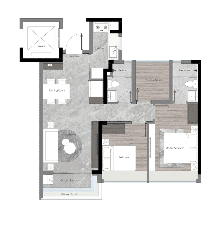 建面约88㎡片区小户型:这款户型被誉为“尺度和配置碾压市面上100㎡产品的贵族户型”。虽然面积不大,但设计极为精妙。它坐拥大平层才有的奢厅入户,三开间朝南,且南向面宽接近9.6米,舒适度爆灯。客厅宽敞明亮,餐厅与厨房相连,动线合理,功能分区明确。两个卧室均朝南,采光极佳,主卧还配备了独立的卫生间,私密性强。对于年轻夫妇或小家庭来说,这款户型既经济实惠,又不失品质感,是上车的首选。