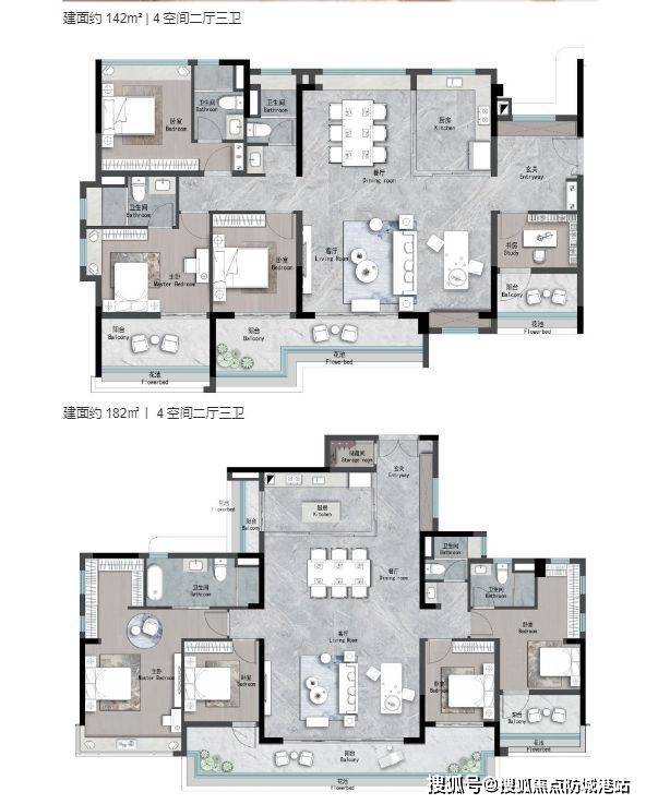 182㎡五房:总价1050万起,双套房配置,中西厨独立,得房率85%。