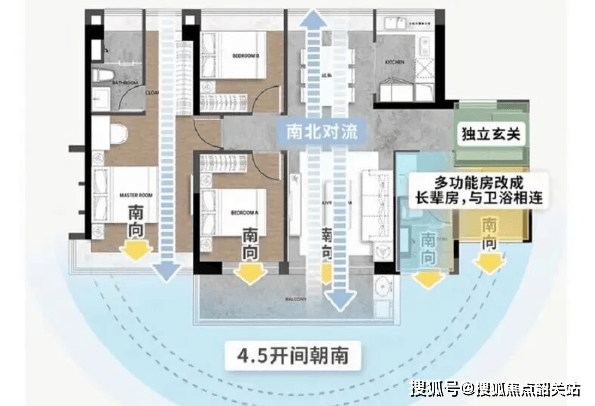 约123㎡三代同堂标杆:金融岛唯一阳光玄关,4.5开间朝南,主卧套房约26㎡,可灵活改造双套间;