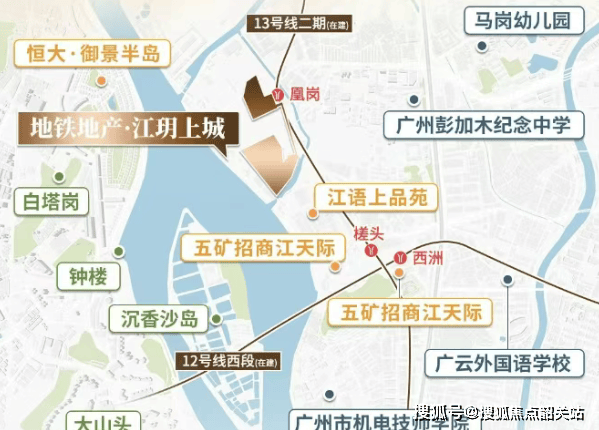 作为广州地铁操盘的TOD典范之作,江玥上城深度融入城市轨道交通脉络。项目紧邻地铁12号线西洲站(已开通),距离仅约800米;同时,13号线二期(朝阳—天河公园段)预计将于明年通车,其凰岗站将与社区实现无缝衔接。未来,业主通过地下通道可直达地铁站,无需换乘即可15分钟内抵达珠江新城核心商务区。