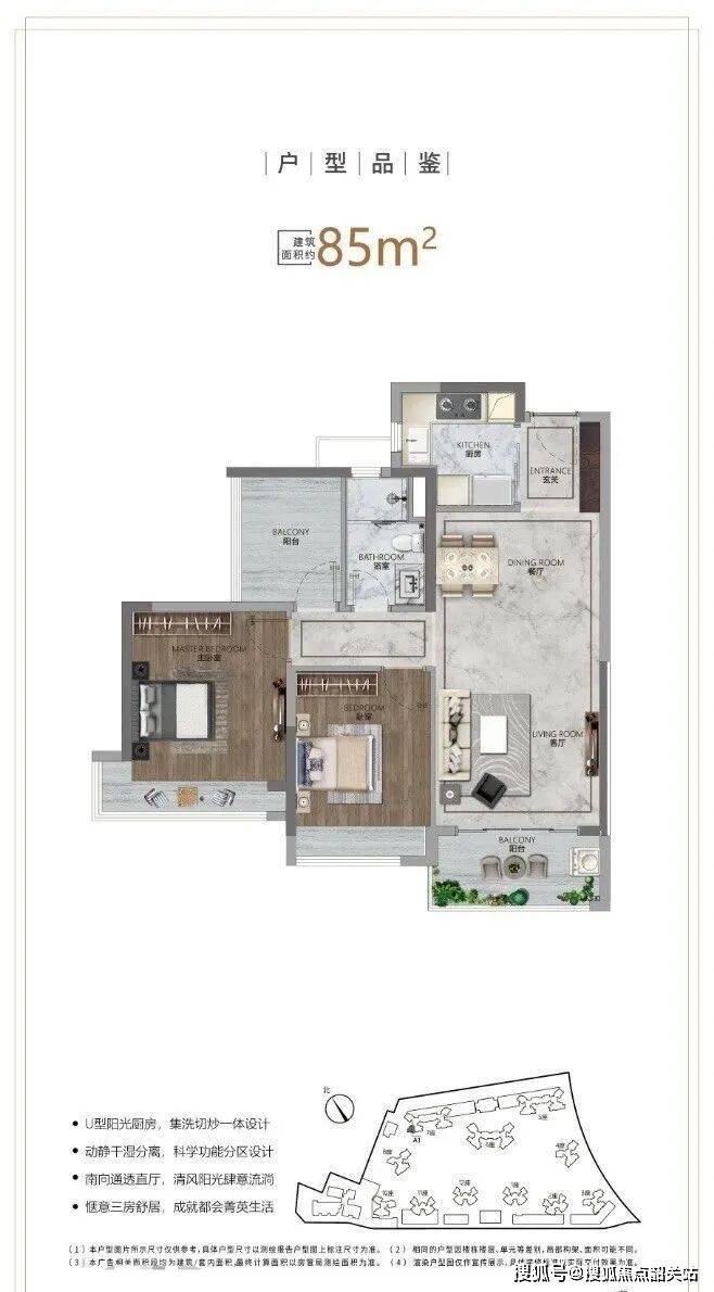 85㎡ “2+1”房两厅一卫:U型阳光厨房设计,动静干湿分离,三开间朝南向布局,适合年轻家庭或单身贵族。
