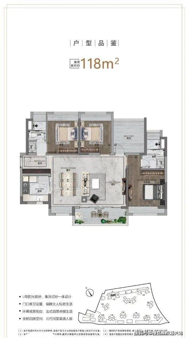118㎡ “3+1”房两厅两卫:U型阳光厨房,环幕观景阳台,全明四房空间,非常适合大家庭居住。