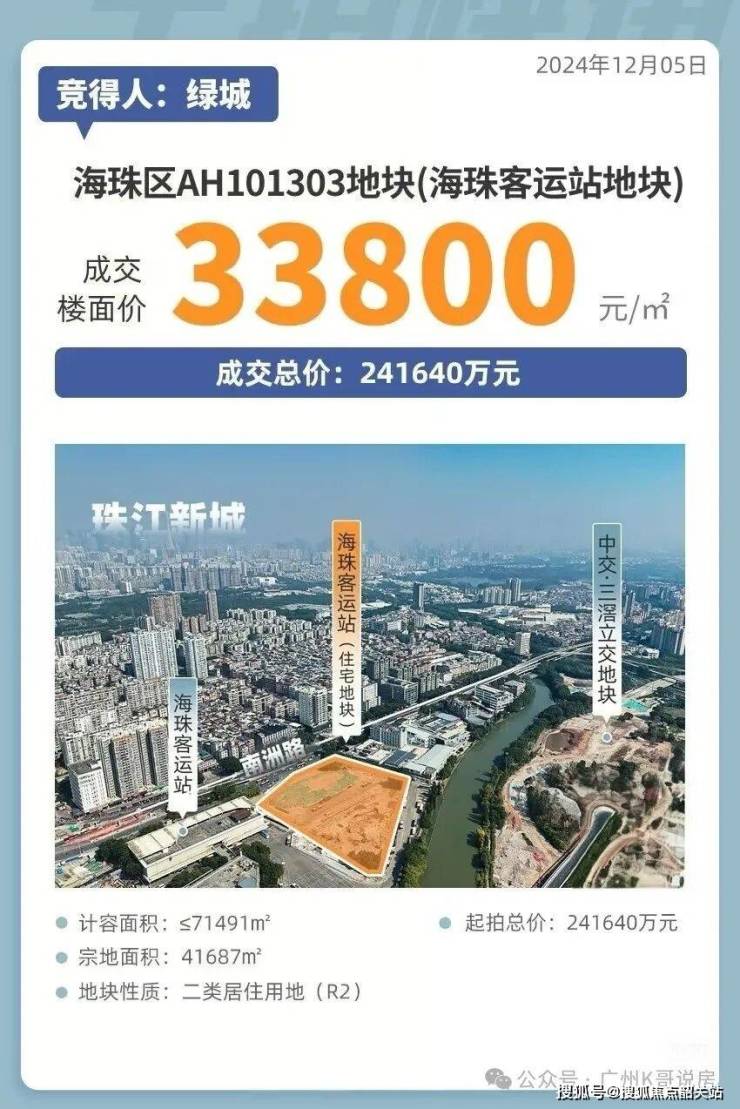 2024年12月5日,绿城拿下海珠客运站地块,总价24.16亿,楼面价3.38万/平。(未扣除配建)
