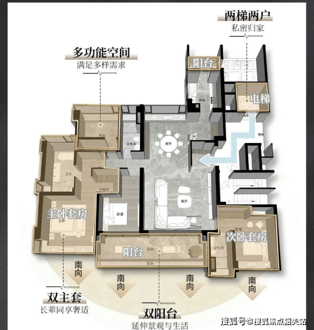 约220㎡大平层,户户四开间朝南,户户南北对流大方厅,户户两梯两户专属归家,户户双主套双阳台……
