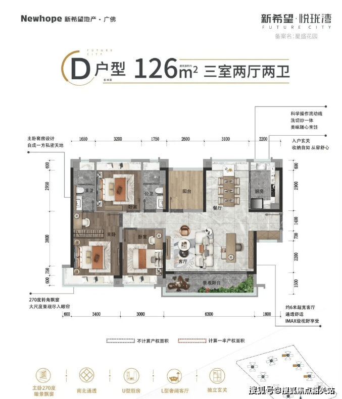126㎡四房两卫:采用LDK一体化设计,客厅连通大尺度阳台,主卧套房化,仅75席,定位改善型家庭。