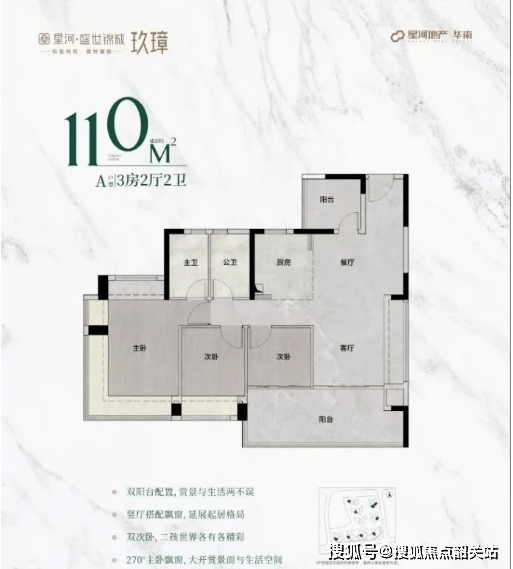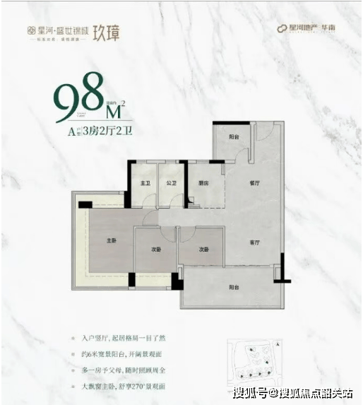 98㎡三房两卫:全屋朝南,主卧配270°无柱飘窗,次卧与阳台尺度升级,采光通透;