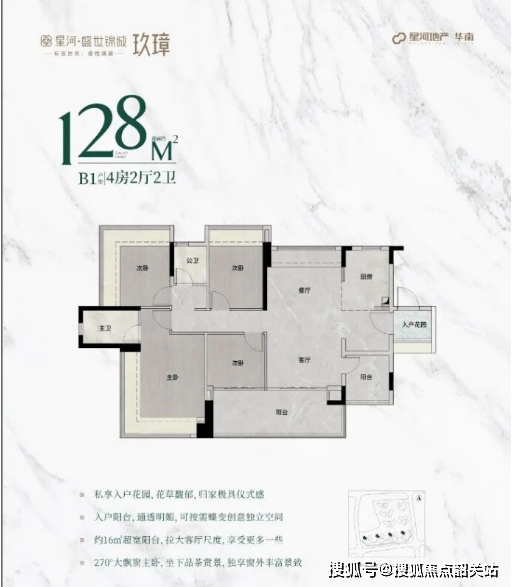 128㎡四+1房:独立入户花园增加收纳,厨房、客餐厅、主卧尺度大幅提升,主卧套房奢适感强。