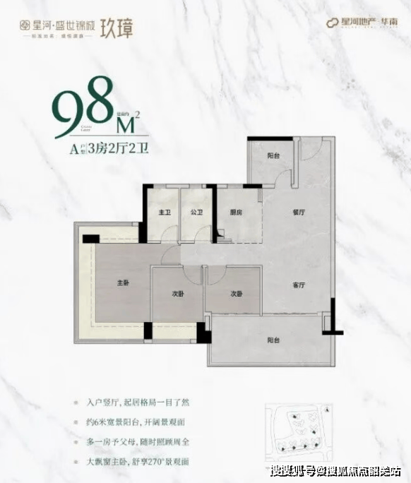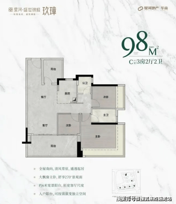 98㎡三房:四开间朝南+LDK一体化厨房,主卧配备270°无柱飘窗;