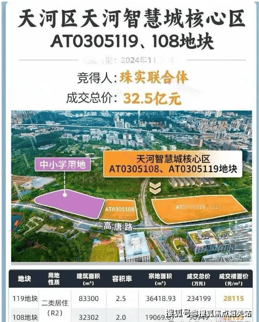 珠江天河都荟位于天河智慧城核心区,地处广深港澳科技创新走廊与广州活力创新轴的关键节点。项目由珠实地产联合体于2024年11月以32.5亿元底价竞得,包含AT0305108与AT0305119两宗地块,总占地面积约5.5万平方米,总计容建筑面积11.56万平方米,整体容积率控制在2.0–2.5之间,属区域内罕见的低密度住宅项目。