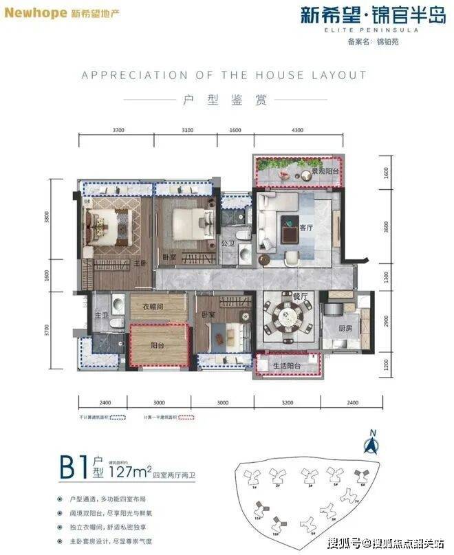 相较于105平方米户型,127平方米的四室两厅两卫产品在空间尺度上进行了全面升级,其最大的技术亮点在于“双阳台”设计带来的真正南北对流。北侧阳台直面一线江景,南侧阳台则俯瞰社区园林,形成了“江园双景”的视觉通廊。这种设计不仅提升了室内的空气质量,加速空气流通,更在心理层面营造出开阔的居住感受。