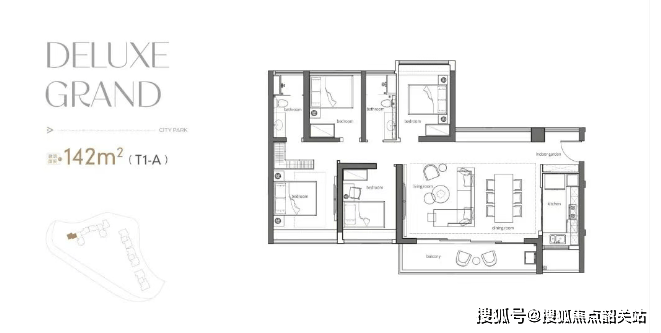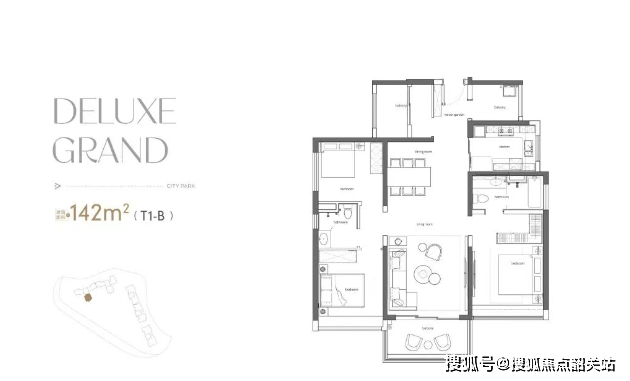 140㎡四房臻品:方正布局,南北对流,全明采光;大横厅设计,奢阔尺度,尽揽山、城、园三重盛景。