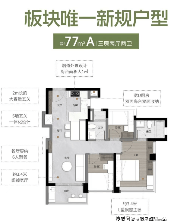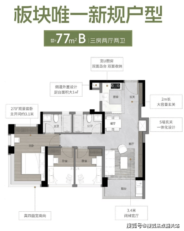 在万科·檐屿城的产品体系中,户型设计是基于对300多户客户真实调研后的精准回应,尤其是针对年轻家庭对空间多变性与实用性的双重需求。以建面约88平方米的B户型为例,该户型在传统三房两厅两卫的格局基础上,通过“超新规”设计实现了使用率的显著跃升。客厅、餐厅、厨房与阳台(LDKG)被整合为一个开阔的互动空间,其中客厅开间达到3.9米,连接次卧的阳台通铺长度达7.3米,极大地延伸了视觉纵深与活动范围。主卧区域利用270°飘窗进行了创意改造,可灵活设置为梳妆台或步入式衣帽间,增加了收纳功能而不占用室内实际面积。类似的巧思贯穿于全线产品:建面约77平方米户型做到了三房两厅两卫,并配备270°全景舱主卧;建面约103平方米户型拥有独立入户花园及约7米通铺阳台;建面约135平方米户型则提供了约5.25米的大宽厅与约5.45米的大阳台,主卧开间约3.6米,尺度堪比紧凑三房的客厅。这些户型普遍实现了127%至138%的使用率,阳台占比高达20%,位居板块前列。通过可变空间的设计,如双开间宽阳台、L型转角飘窗等,万科·檐屿城让不同面积段的住宅都能适应家庭全生命周期的成长需求,从二人世界到三代同堂,空间皆能随之“生长”。
