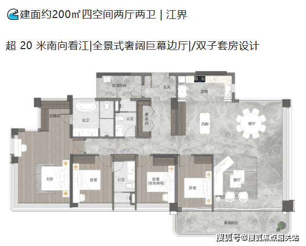 至于200㎡的楼王户型,更是将奢华演绎到了极致。超过20米的南向看江面宽,仿佛将整个珠江拥入怀中。全景式奢阔巨幕边厅,让人仿佛置身于五星级酒店的行政酒廊。双子套房的设计,赋予了主人双倍的特权与私密享受。每一寸空间都被精心雕琢,每一处细节都彰显着不凡的品味。