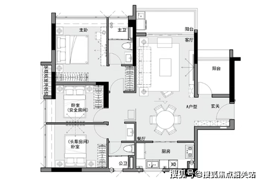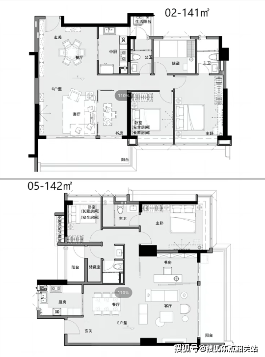 139-142平方米四房两卫:拥有6.7米长的景观阳台,主卧采用270°飘窗设计,空间利用率极高,适合三代同堂的家庭居住。