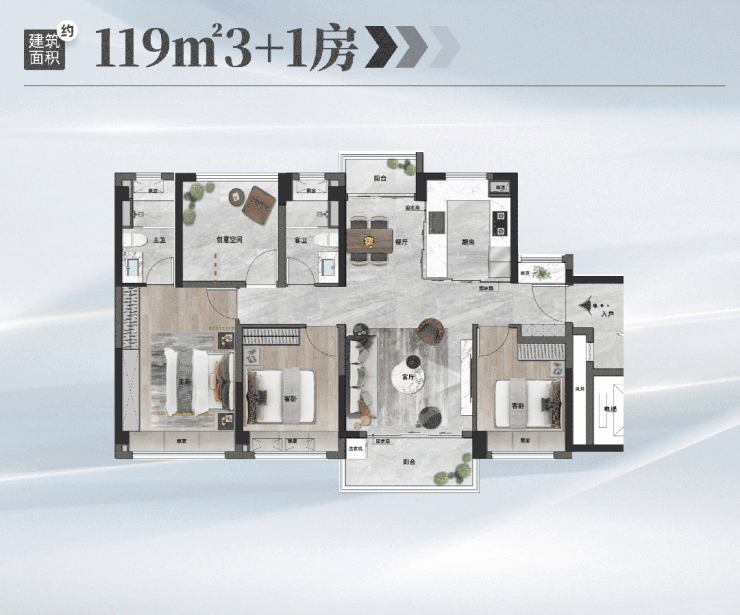 建面约119㎡户型,全屋通透、对流。无论是在沙发上看电视,或是在餐厅吃饭,都能感受清风、阳光的环抱。