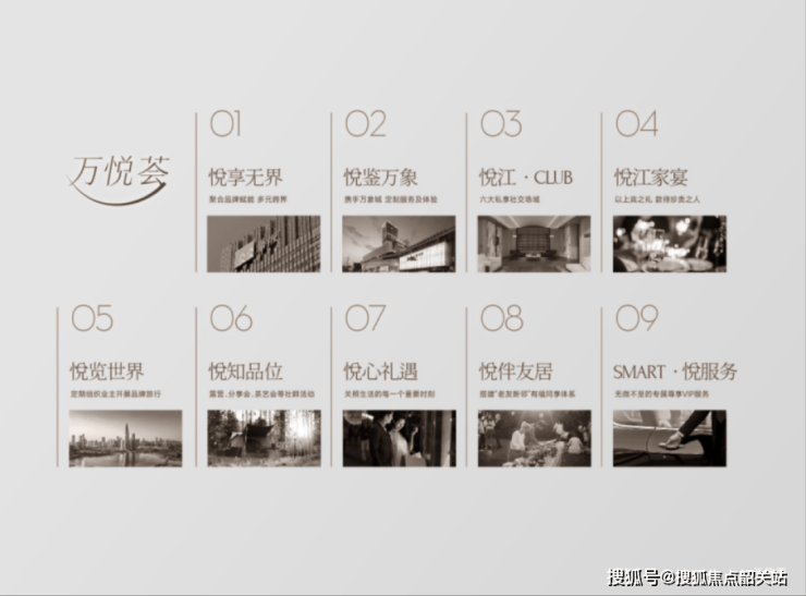 「万悦荟」整合多元业务领域,联手行业领先国际品牌,为业主带来系统化、定制化的全新滨江万象生活方式,包括:悦享无界、悦鉴万象、悦江·CLUB、悦江家宴、悦览世界、悦知品位、悦心礼遇、悦伴友居、SMART·悦服务9大权益。