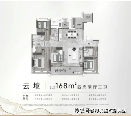 168㎡纯改善四房:板式大平层,专梯入户,约 7 米超宽阳台览一线山景,中西厨设计。屋内预设多条归家动线,减少干扰。观景效果极佳,尺度感与宜居感兼备。