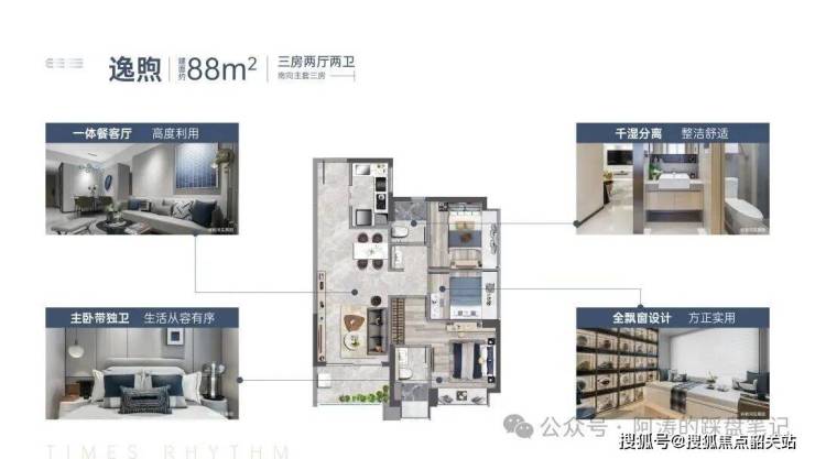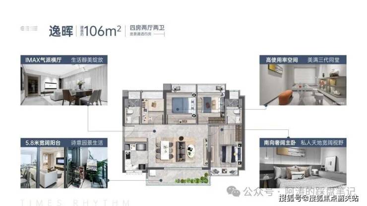 户型合理:户型面积从80㎡三房到106㎡四房不等,设计方正实用,全飘窗、动静分区,采光通风良好,满足不同家庭需求。