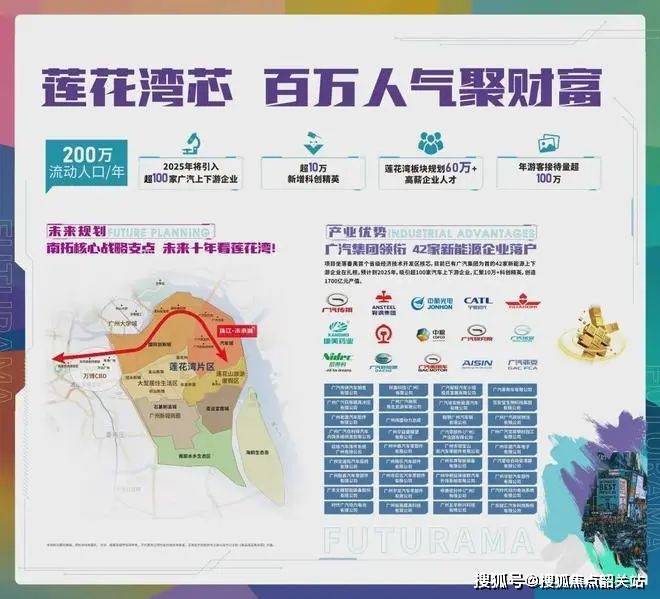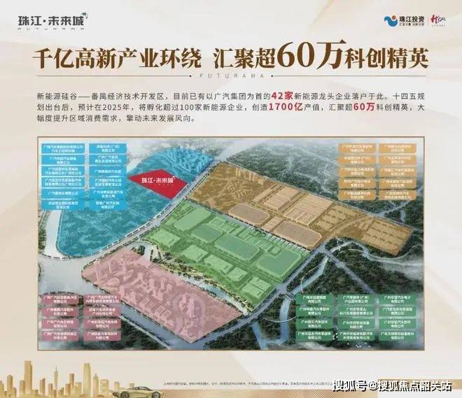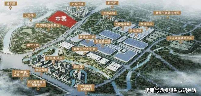 产业集群:周边以广汽集团领衔,已有42家新能源企业落户,预计到2025年将超过100家,汇聚超60万科创精英和高薪企业人才