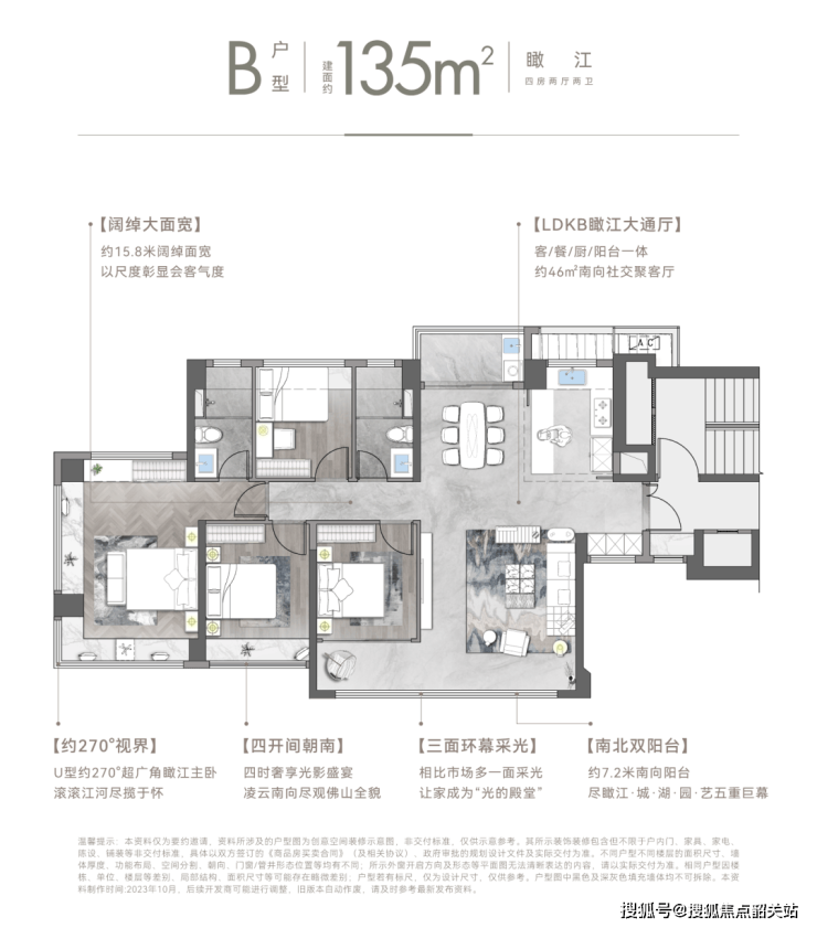 项目尊享公里级楼间距、户户东南向瞰江,以约 270° 超广角无遮挡视野纵览五重盛景。户型设计上,约 14-17 米阔景面