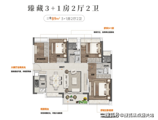 建面约89㎡ 4房2厅2卫户型,格局方正,能够满足三代同堂一步到位的居住需求;独立单边位设计,实现了南北对流,大横厅南向采光、通风、观景效果俱佳;对比周边同面积段户型,该户型多一房且价格更低,性价比极高。