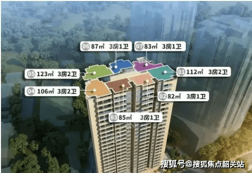 君曜府采用单栋塔楼设计,共25层,3梯7户布局,主力户型为82㎡三房、98㎡三房、115㎡四房及123㎡四房,整体定位偏向“刚改”与“小改善”客群。