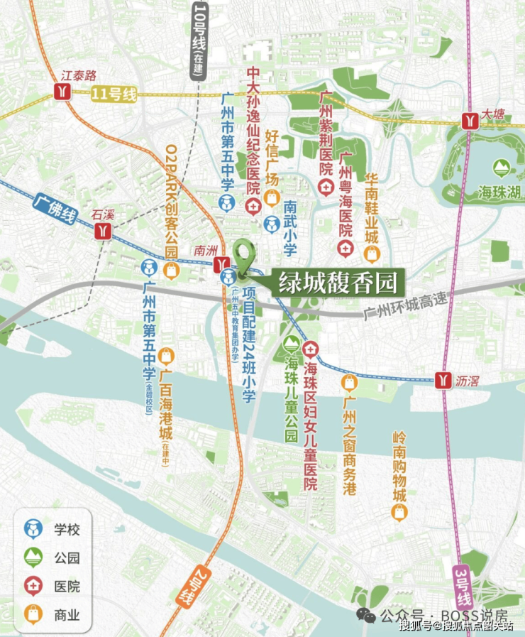 紧邻地铁 2 号线与广佛线换乘站南洲站,步行距离极近(约 200 米内),规划有地下连廊 / 地库直连地铁站,风雨无阻;