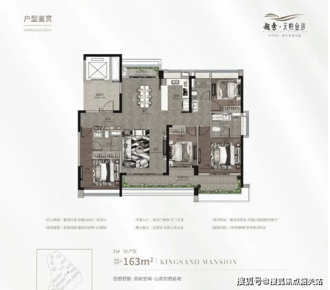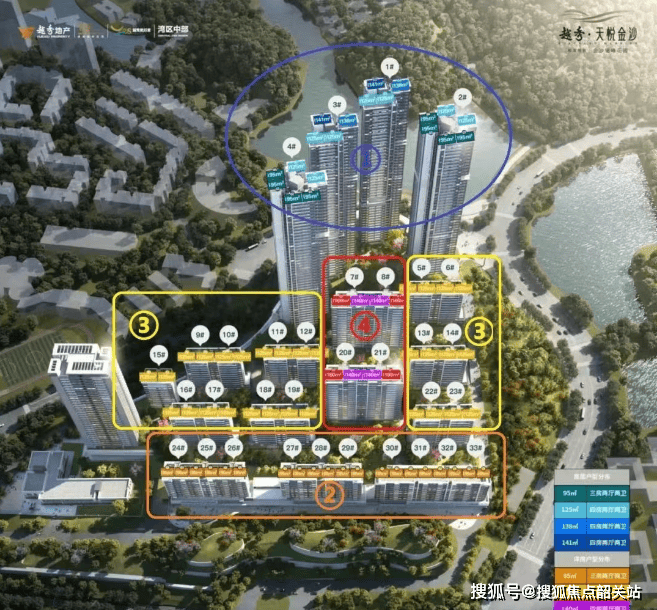 建面约138-160㎡:南向四房带主套,超高层湖山IMAX景观四房户型,多面宽+270℃观景阳台。