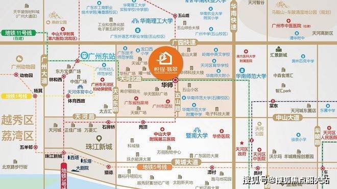 交通方面,悦珵·翡翠享受三地铁交汇的便利,广州地铁3号线、10号线和11号线在这里汇聚,最近的华师站仅步行约300米。乘坐地铁两站就能抵达广州东站,四站直达珠江新城,五站到广州塔,日常通勤或者周末出行都非常高效。从项目到广州东站开车仅约3公里,15分钟左右就能上高铁,一小时内轻松连接大湾区其他核心城市。周边300米内有龙口西路站、翰景路站、师大后门站、五山路站四个公交站点,覆盖超过20条公交线路,路网发达。广园快速和华南快速也在附近,驾车出行同样顺畅。