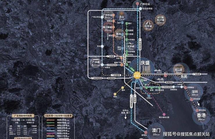 所在的庆盛枢纽区交通网络发达,享受国家级政策红利。高铁方面,庆盛站是广深港高铁的重要站点,9 分钟可直达东莞虎门,30 分钟至深圳北,35 分钟到达香港西九龙,未来规划的广中珠澳高铁将进一步强化区域联动。地铁方面,虽 4 号线已运营,22 号线、31 号线、33 号线尚在规划中,但未来一站可达番禺广场,快速通达广州核心区。此外,项目创新设计超级空中连廊,安全遮雨遮阳,串联居住地块、产研地块、港科大(广州)、东涌地铁站及多个公园,使居民步行即可到达各大配套设施,提升出行便捷性。