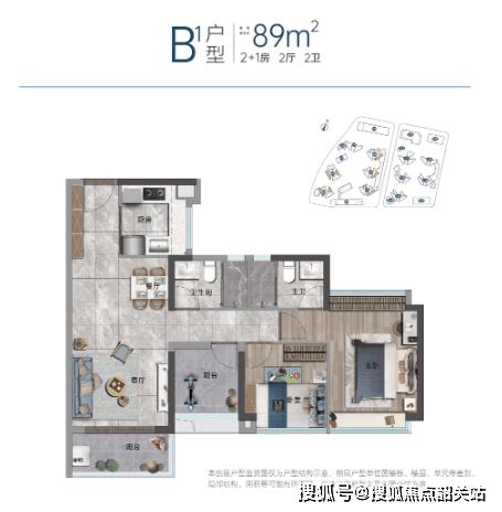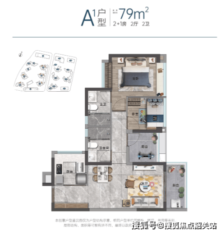 特色:即使是较小的79㎡户型也能设计成三房两卫,极大提升了空间利用率。