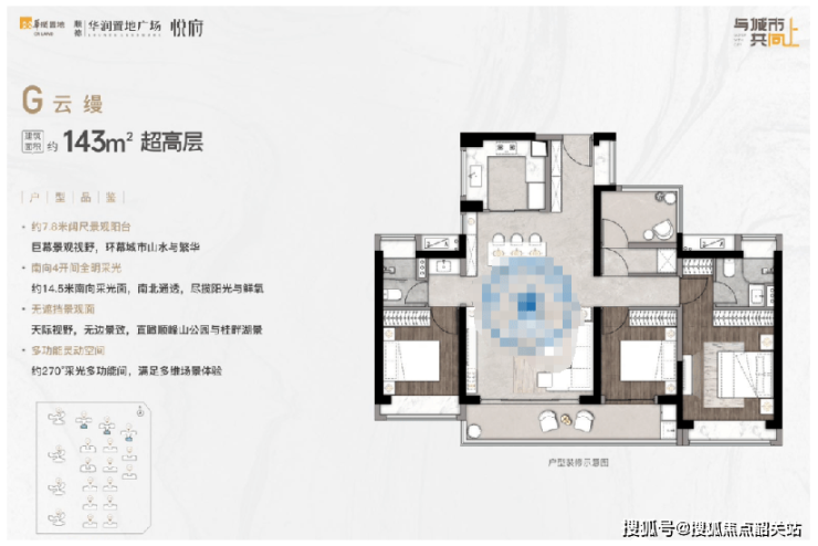 顺德华润置地广场悦府提供多种户型选择,建筑面积从128㎡至195㎡不等的精装四房单位,满足不同家庭的需求。特别值得一提的是,项目将推出约200-423㎡瞰湖天墅,填补市场空白,以全新的顶豪产品焕新人居想象。所有户型设计均注重采光与景观视野,户户朝南,并配备南向超大景观阳台。