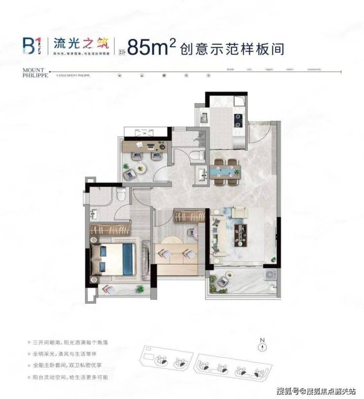建面约85㎡-3房2卫,三开间朝南,空间南北通透