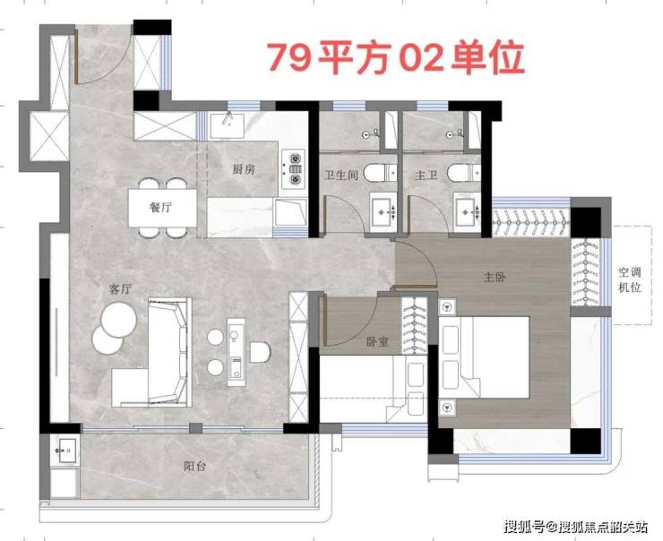 79方的A2户型,3房2卫,一样有5.3米面宽阔景阳台,以及270°大飘窗主卧。这个是飞机户型。