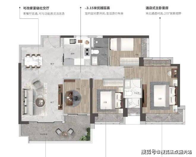 所有户型均标配约3.15米层高(部分达3.3米),比普通住宅高出12.5%,为后期加装中央空调或局部改造预留空间。