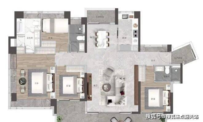 141㎡四房三卫:双主套设计适配三代同住,6.85米南向阳台进深达2.6米;