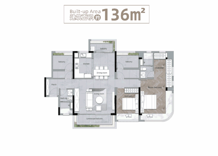 约136平是约115平的和韵户型放大版,增加了转角玄关、内阳台,值得一提的是主套间的飘窗是弧形的,观景面会连贯一些。