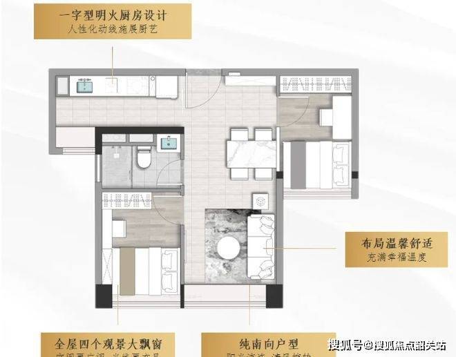 户型整体布局紧凑合理,功能分区明确。进门处可设置为开放式厨房区域,操作台面和收纳空间一应俱全,满足日常烹饪需求。厨房旁边可打造为客厅区域,放置简约的沙发、茶几,形成舒适的休闲空间。通过合理的家具布置,让有限的空间发挥出最大的效用。