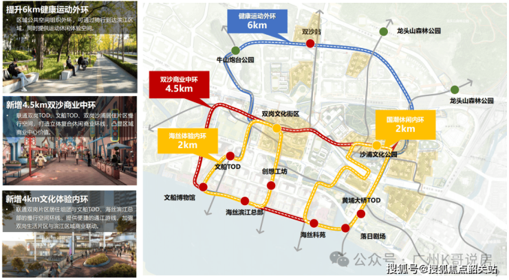 构建“两轴、一带、三廊、三环”的慢行系统网络,三环分别为6公里运动外环连接滨江,4.5公里商业中环连接华润万象系TOD商业,4公里文化体验内环连接各重要空间。