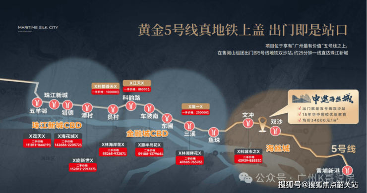 项目是临港经济区的重要功能节点,双沙旧改地块众多,首开区具体位置在5号线双沙地铁站B口附近,与地铁5号线双沙站的直线距离仅约50米,与地铁13号线双岗站直线距离也不到500米,双地铁站护航,交通条件优越,从项目出发,2站到鱼珠CBD,5站金融城,6站琶洲东区,10站直达珠江新城,囊括广州最重要的几个CBD。