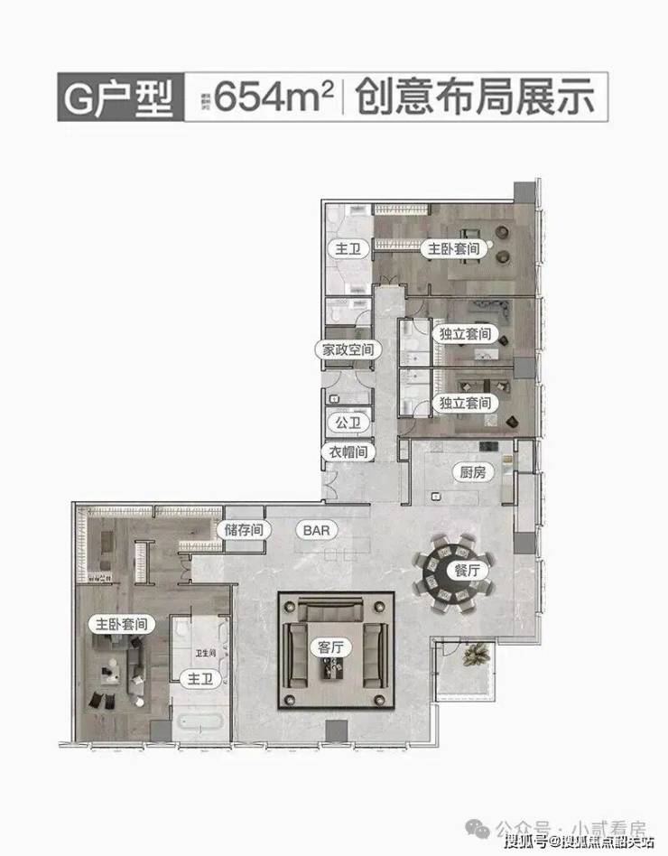 450㎡四房两厅四卫户型,面宽约 22 米,五开间朝南,270° 环幕江景,客厅挑高约 3.6 米,打造旗舰级星级会客厅,适合商务接待与家庭聚会。654㎡五房两厅五卫户型,为顶层复式设计,赠送约 80 平方米空中花园,可打造私人泳池、观景台等,享受极致江景与城景,是塔尖人群的终极居住选择。