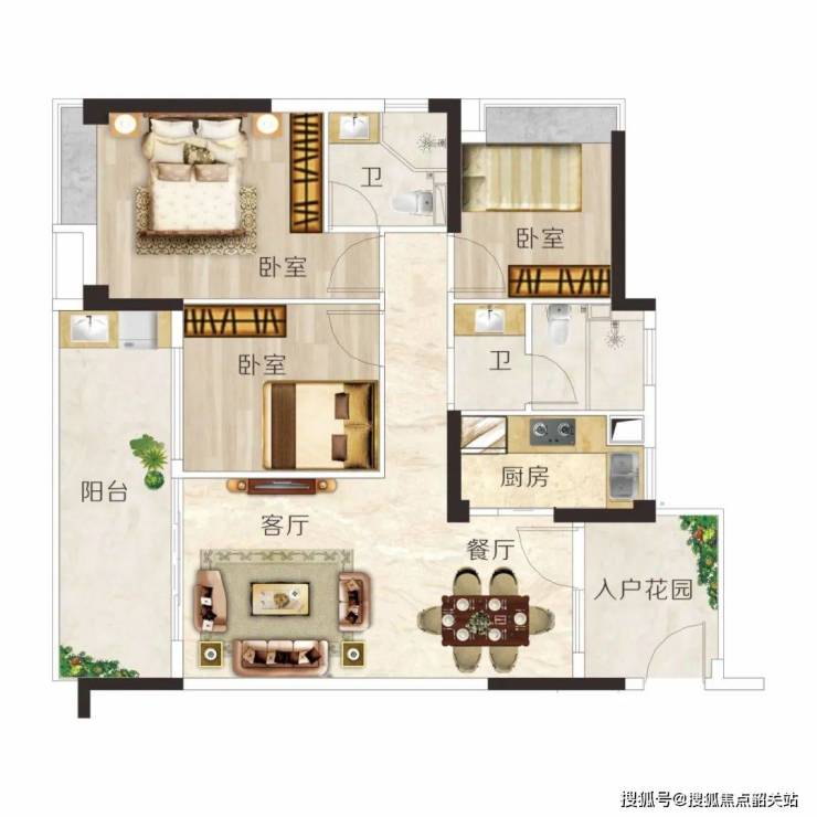 建面约101平方米 3房2厅2卫:入户花园设计,主卧套房配备超广角阳台。