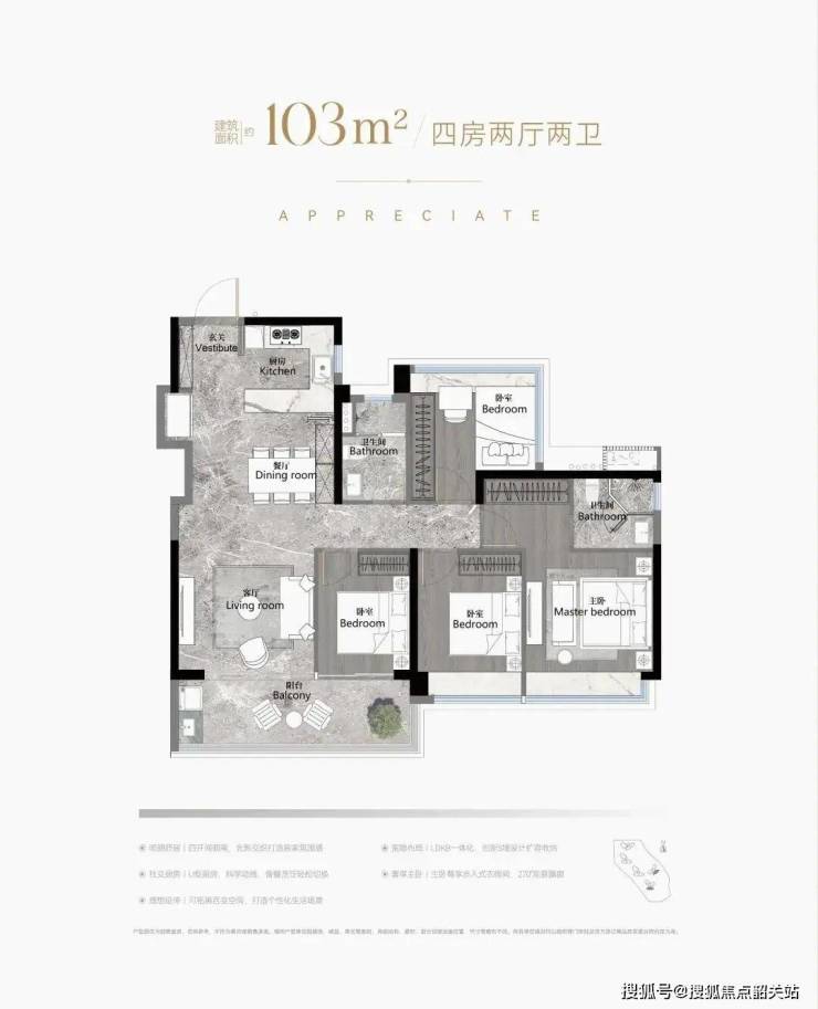 注:得房率=套内使用面积÷建筑面积。传统住宅得房率约75%-85%,本项目通过优化公摊、阳台飘窗可改造等设计,实现“买103㎡得120㎡”的实用奇迹。